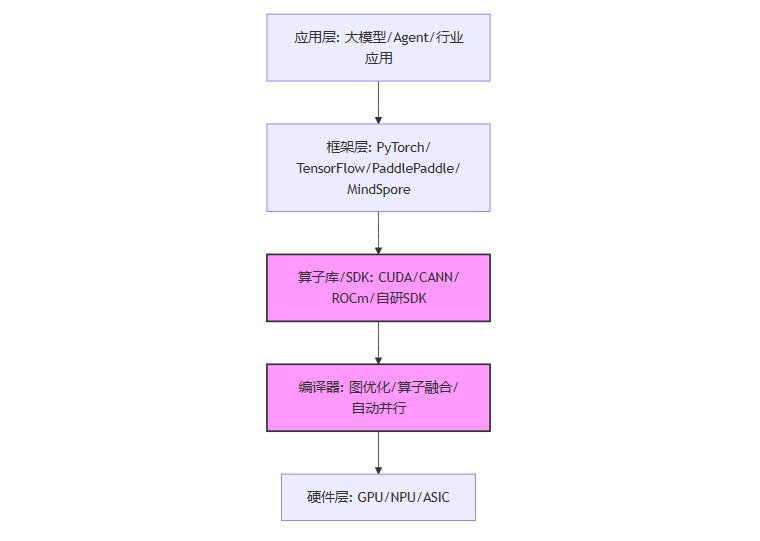 A[应用层: 大模型/Agent/行业应用] --> B[框架层: PyTorch/TensorFlow/PaddlePaddle/MindSpore]