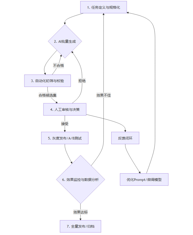 这个闭环流程的精髓在于,它不仅是一个线性的生产线,更是一个能够持续学习和自我优化的系统。每一次人工决策和来自真实世界的业务数据反馈,都应该被系统地收集起来,用于迭代和改进上游的AI生成环节,形成一个正向的飞轮效应。
