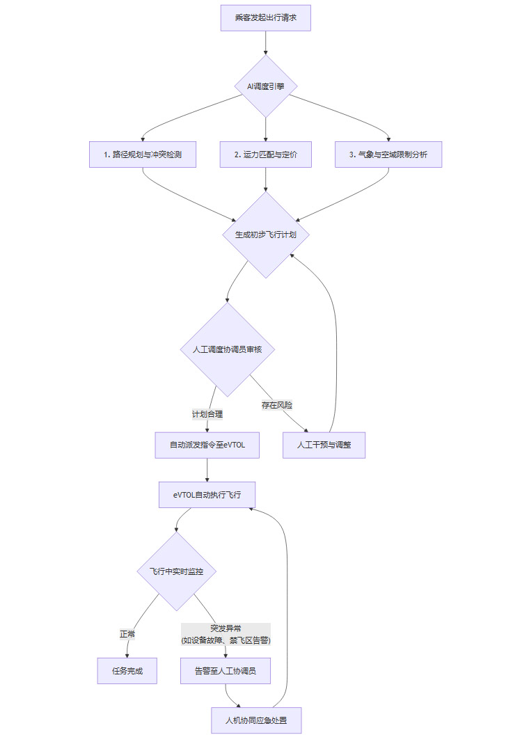 智能化的引入,催生了全新的工作流程。以城市空中交通(UAM)的运营为例,一个典型的“人机协同”调度工作流如下所示。