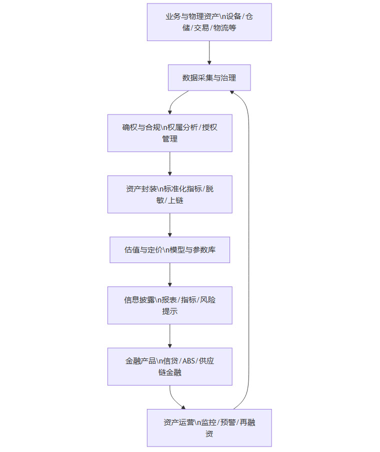 从业务侧接入高质量数据,经由中台完成确权和封装,再通过估值和披露进入金融机构的风控与产品设计流程,之后在资产运营阶段把新增数据和风险事件再反馈回中台。