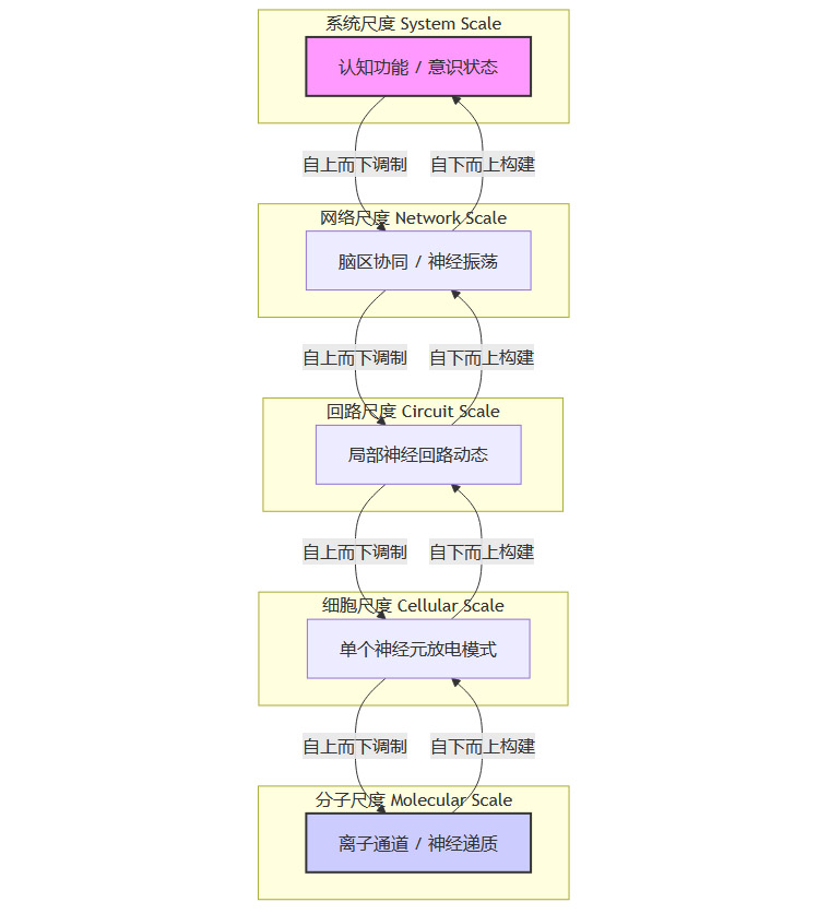 大脑的组织是跨尺度高度耦合的。一个位于神经元膜上的离子通道蛋白的微小构象变化(分子尺度),可能会改变单个神经元的放电模式(细胞尺度),进而影响一个局部神经回路的振荡节律(网络尺度),最终可能关联到一个完整的认知功能或意识状态(系统尺度)。