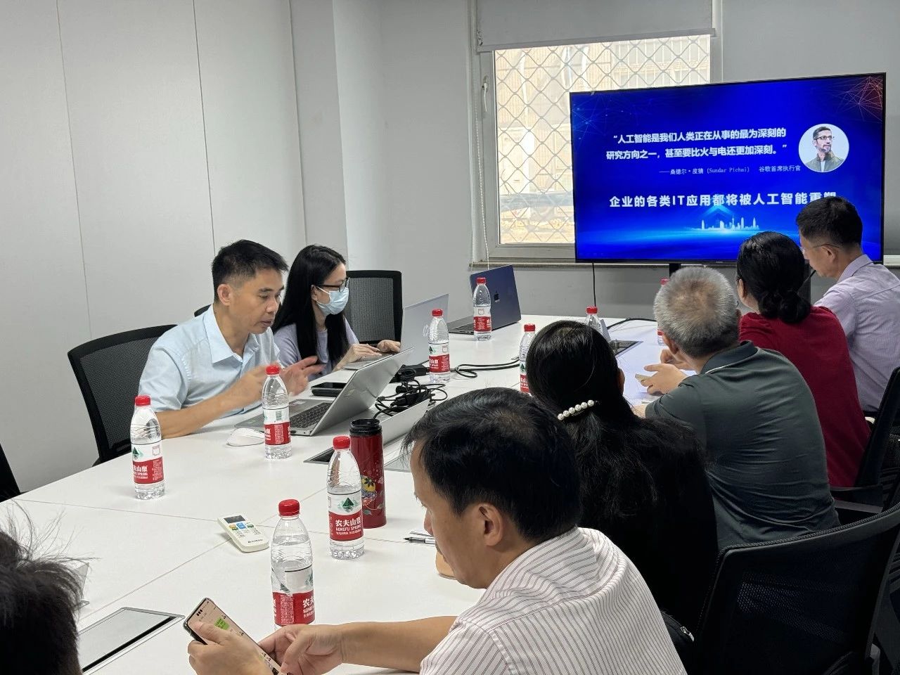 陈天祥教授一行受到运通链达CEO邹均博士及公司员工的热烈欢迎。双方就目前大模型技术的发展以及企业在大模型应用方面面临的挑战做了深入的探讨。大家一致认为,积极开展面向企业员工的AI培训是克服目前大模型人才短缺的关键,同时,大力推广大模型中间件可以大幅降低企业大模型应用落地的技术门槛和成本。最后,院校、科研机构和企业需要更广泛地集聚数字力量,加速企业数字化转型和数据要素化进程。